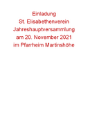 Am 20. November 2021 findet im Pfarrheim Martinshöhe um 15.00 Uhr die Jahreshauptversammlung des St. Elisabethenvereines statt. Hierzu laden wir alle Mitglieder herzlich ein.