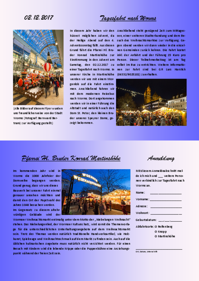 Zur Einstimmung auf den Advent fährt die Pfarrei Hl. Bruder Konrad am 02.12. nach Worms.