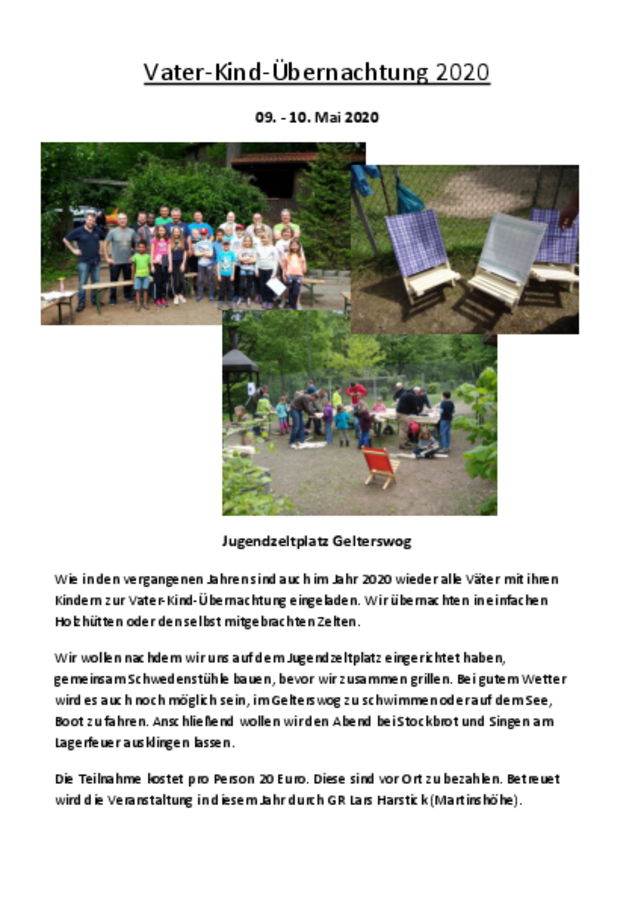 Wie in den vergangenen Jahren findet die Übernachtung an Jugendzeltplatz Gelterswog statt. Der Termin ist von 09. auf den 10. Mai. Weitere Informationen erhalten Sie beim GR.