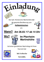 Der Kirchenchor Martinshöhe lädt am 26.03.2017 um 14:00 Uhr ins Pfarrheim nach Martinshöhe ein.