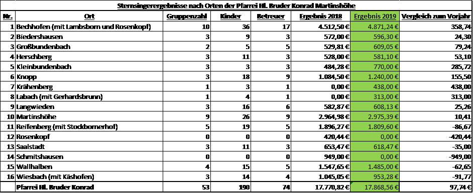 Nachdem alle Vorbereitungen getroffen waren, insbesondere das Lernen der Texte, verteilen der Gewänder und Sterne startete in der Pfarrei Hl. Bruder Konrad Martinshöhe am Freitag, den 04.01.2019 um 18:00 Uhr die diesjährige Sternsingeraktion mit der Aussendung in Bechhofen. GR Lars Harstick, der für die Aktion in der Pfarrei zuständig ist, gestaltete die Wortgottesfeier und dankte den Kindern dass sie das diesjährige Motto "Wir gehören zusammen" leben und sich für Kinder in Peru und der ganzen Welt einsetzen. Ausgerüstet mit den Sternsingertaschen mit der geweihten Kreide, Dankzetteln und allem was man zum Sternsingen braucht machten sich die kleinen Könige dann am Samstag und Sonntag auf den Weg durch die Pfarrei. An diesem Wochenende waren somit wieder 50 Sternsingergruppen mit knapp 200 Königen unterwegs. Unterstützt wurden sie von rund 70 Betreuern, die sie begleiteten oder für eine warme Mahlzeit sorgten. Insgesamt konnten in der Pfarrei bisher 16.865,96 Euro für die Projekte der Sternsinger gesammelt werden. Den Abschluss beim Sternsingen bildet am kommenden Samstag der Ort Kleinbundenbach, in dem zum Abschluss die Sternsinger für die Projekte des Kindermisionswerks unterwegs sein werden.
