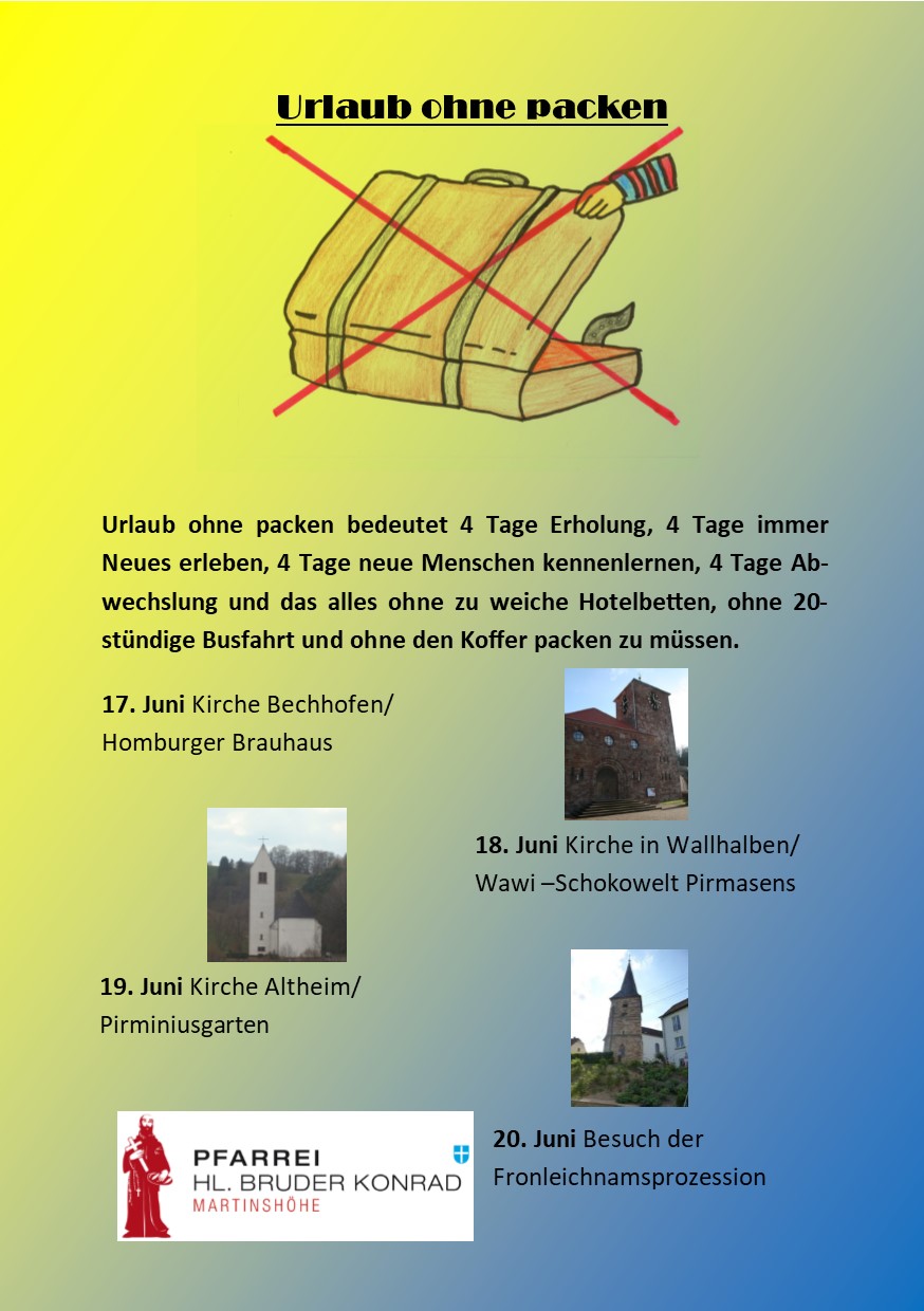 Auf die Senioren warten im kommenden Jahr wieder abwechslungsreiche Tage in der der näheren Umgebung. Die Tage bieten wieder ein buntes Programm, die jeweils mit einem Frühstück im Pfarrheim beginnen. Anschließend wird die Kirche des jeweiligen Ortes erkundet und gemeinsam eine Andacht gefeiert. Nach dem Mittagessen steht dann ein weiterer Programmpunkt an. Unter diesen werden in diesem Jahr der Pirminiusgarten in Altheim, die gläserne Produktion der Wawi-Schokoladenfabrik und das Homburger Brauhaus besucht. Die Tage finden vom 17. - 20. Juni statt. Den Abschluss bildet der Besuch des Fronleichnamsfestes in unserer Pfarrei. Alle interessierten Senioren können sich ab sofort wieder beim GR anmelden und erhalten bei ihm auch weitere Informationen zum Programm.