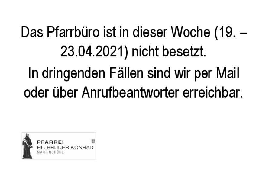 Das Pfarrbüro ist in der Zeit vom 19. - 23.04.2021 nicht besetzt.