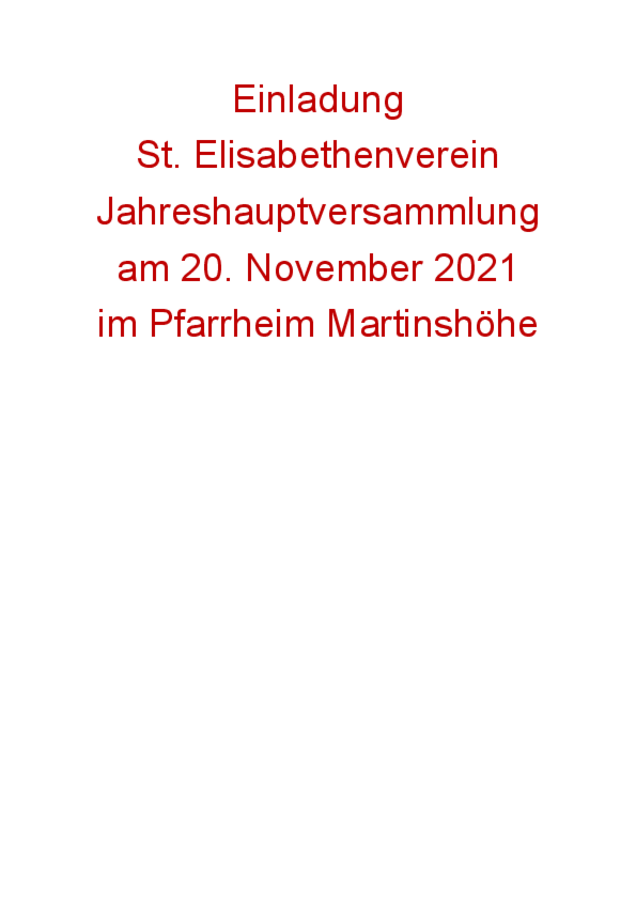 Am 20. November 2021 findet im Pfarrheim Martinshöhe um 15.00 Uhr die Jahreshauptversammlung des St. Elisabethenvereines statt. Hierzu laden wir alle Mitglieder herzlich ein.